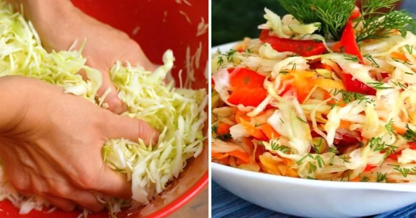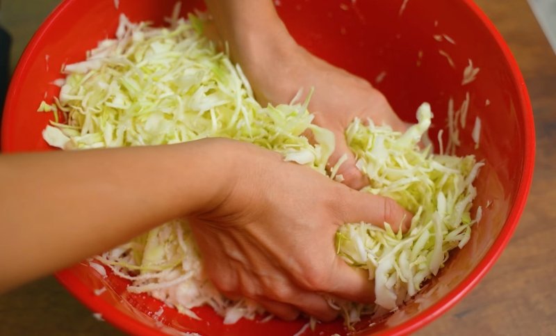 1. Kapustę drobno poszatkuj, przełóż do dużej miski i posyp czubatą łyżeczką soli i cukru. Ugnieć ją dłonią – powinna puścić sok.