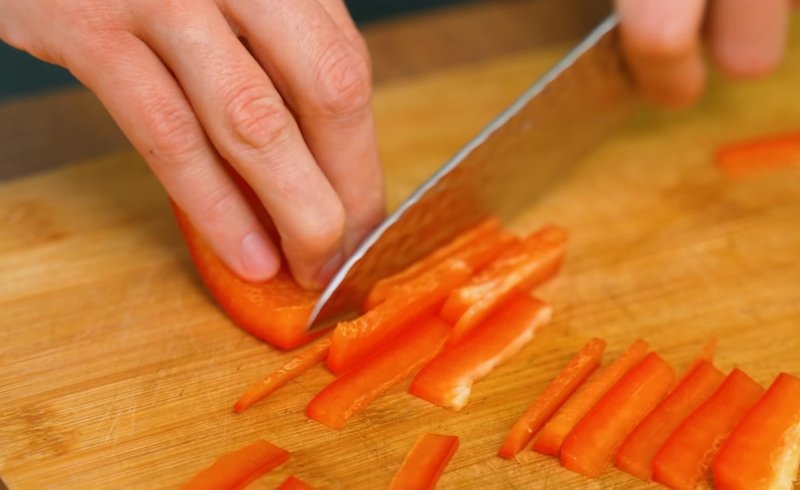 2. Paprykę umyj i usuń gniazdo nasienne. Potem pokrój w drobne słupki i wymieszaj z kapustą.