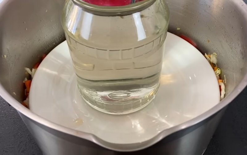 5. Ubij kapustę w misce, przykryj talerzem i dociąż słoikiem z wodą. Wstaw do lodówki na 3-4 godziny. Gotowe!