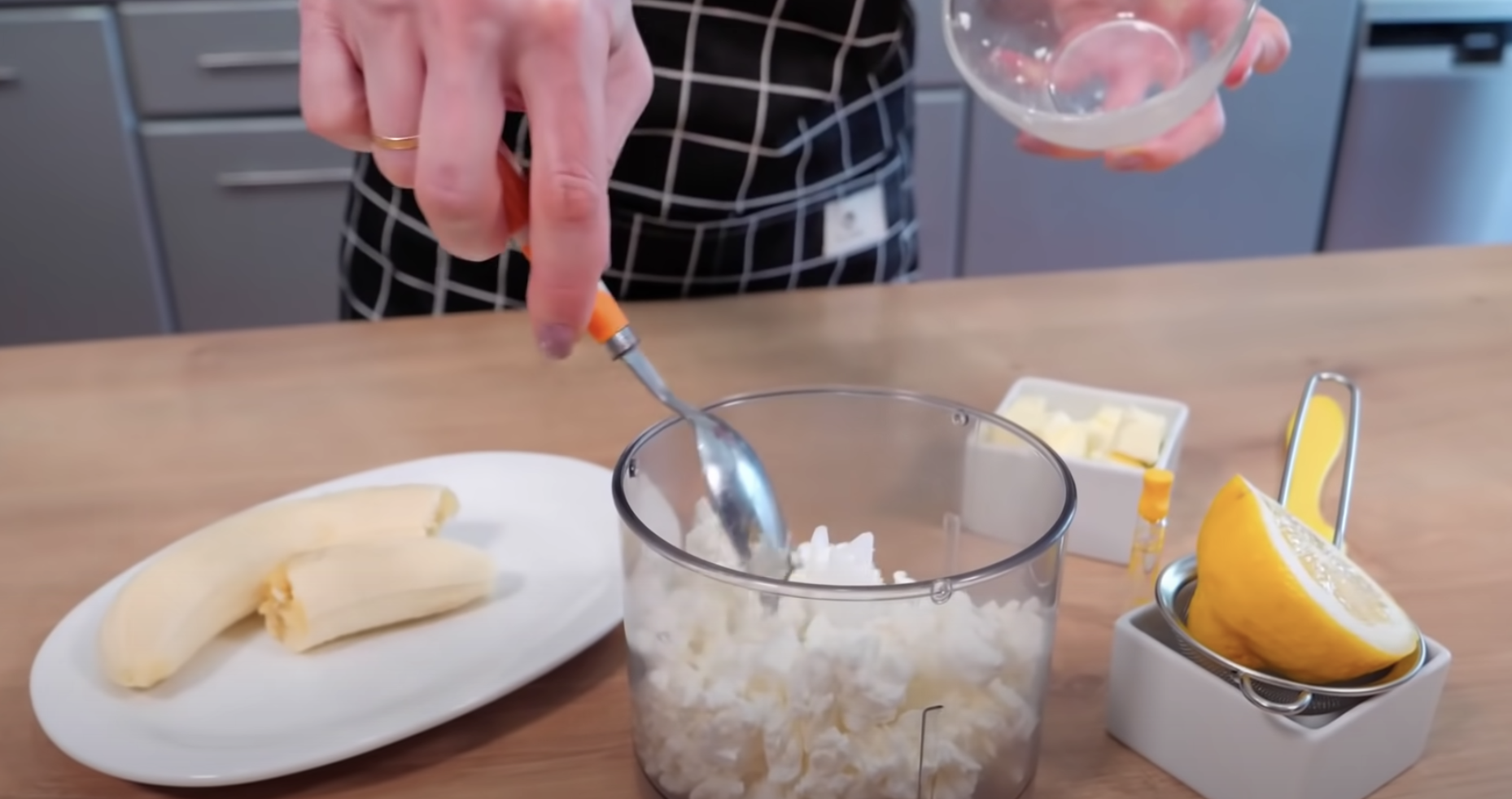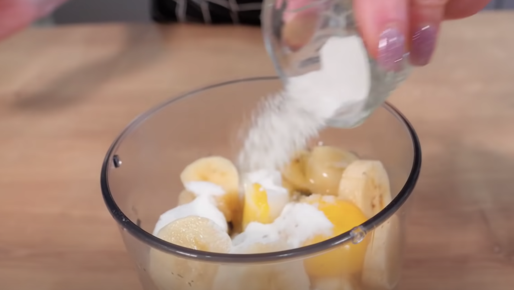 1. Obrane ze skórki banany, pokrój na mniejsze kawałki, dodaj jajka oraz pozostałe składniki na ciasto i zmiel blenderem na gładka jednolitą masę.