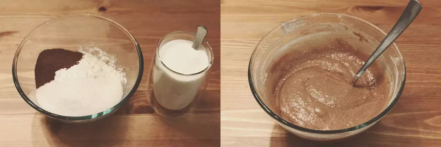 1. W misce, wymieszaj sodę zgaszoną w kefirze z mąką, cukrem i kakao.