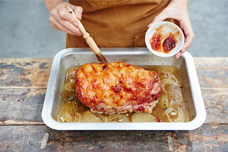 6. Ponownie wyjmij formę z piekarnika, wysmaruj na całej powierzchni dżemem z pomarańczy i piecz kolejną godzinę. Gotowe!