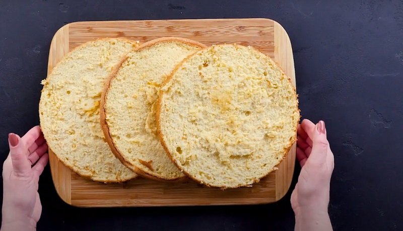 2. Gotowe ciasto przełóż do formy, wyłożonej papierem do pieczenia o średnicy 21 cm. (nie smaruj formy tłuszczem, bo biszkopt nie urośnie). Piecz w piekarniku, rozgrzanym do 180 stopni C, przez 35 minut. Do całkowitego wystygnięcia, nie wyjmuj biszkopta z piekarnika. Wystudzonego biszkopta, przekrój na 3 części.
