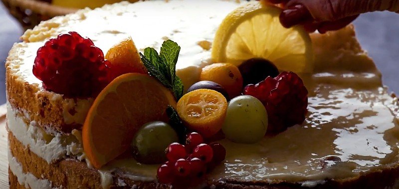 9. Po tym czasie, usuń formę i folię zabezpieczającą i wysmaruj boki oraz wierzch wyższego piętra przygotowanym wcześniej kremem. Wygładź i poukładaj na wyższym piętrze pozostałe owoce oraz listki mięty. Gotowe!