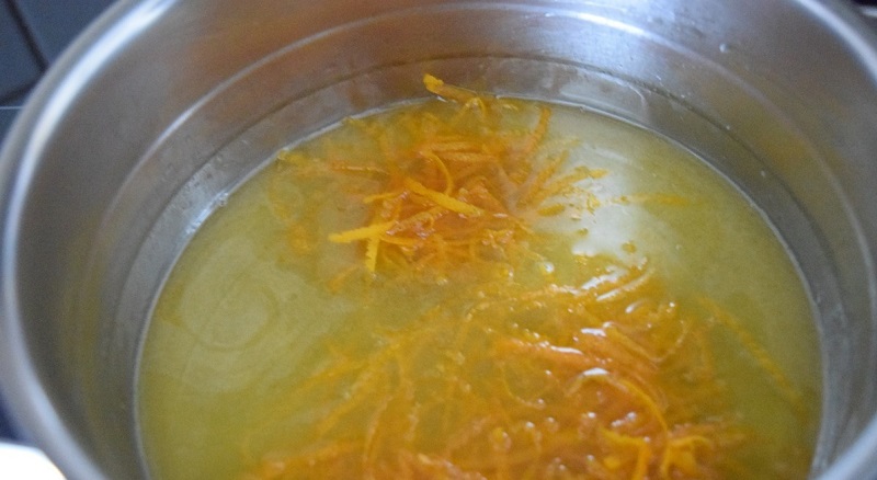 9.W między czasie możesz przygotować krem. Do garnka wlej 80 ml soku z pomarańczy, po czym dodaj do niego cukier, całość gotuj na małym ogniu do momentu, aż cukier się rozpuści. Następnie dodaj przygotowaną wcześniej skórkę z pomarańczy, całość gotuj jeszcze około 5 minut.