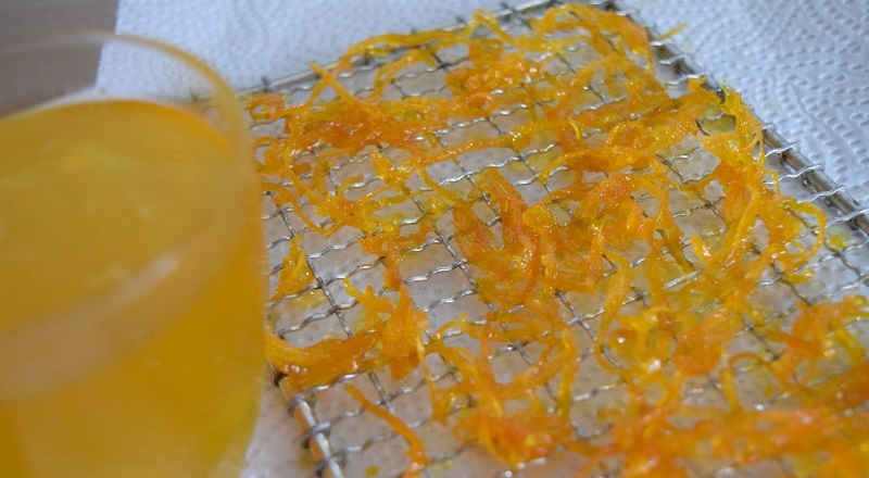 10.Po upływie tego czasu wyjmij skórkę i pozostaw całość do wystygnięcia. Wyłożoną na kredce skórkę włóż do piekarnika i kandyzuj ją przez kilka minut.