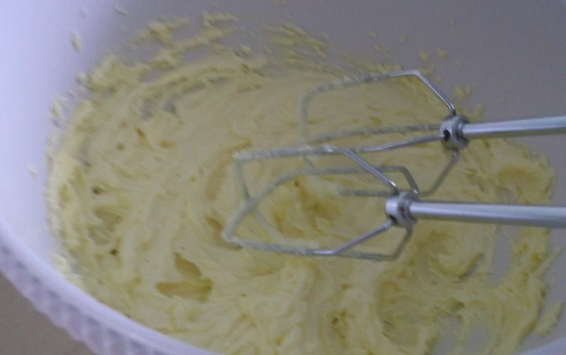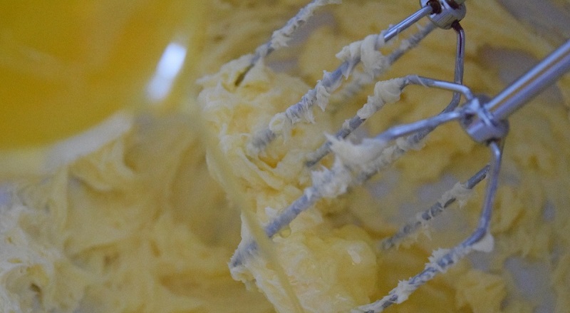 4.W osobnej misce połącz ze sobą masło z cukrem, następnie dodaj jajka, po czym za pomocą miksera mieszaj przez około minutę.