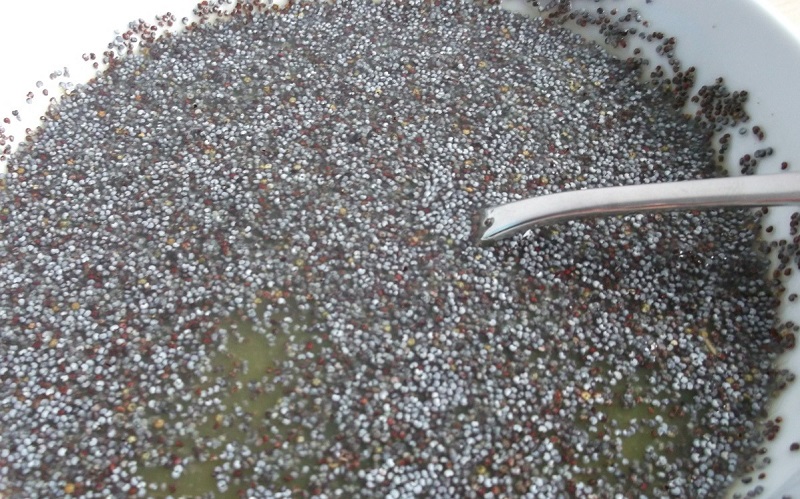 3.Wsyp mak do dużej miski, następnie zalej go wyciśniętym sokiem . Tak przygotowany mak pozostaw na kilka minut.