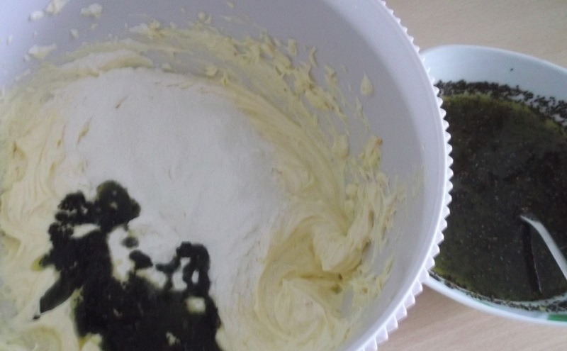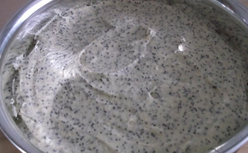 6.Podczas wsypywania mąki, koniecznie dodawaj także mak z całym sokiem. Wszystkie składniki dokładnie połącz ze sobą, aby powstała jednolita konsystencja.