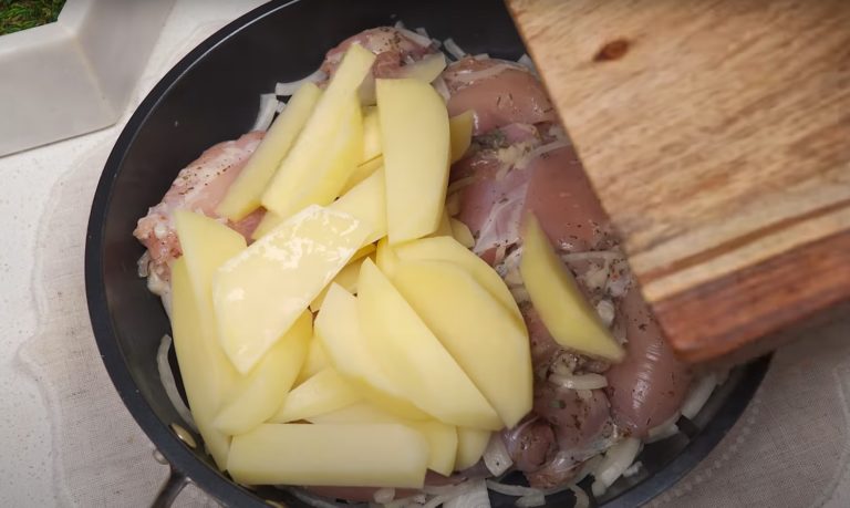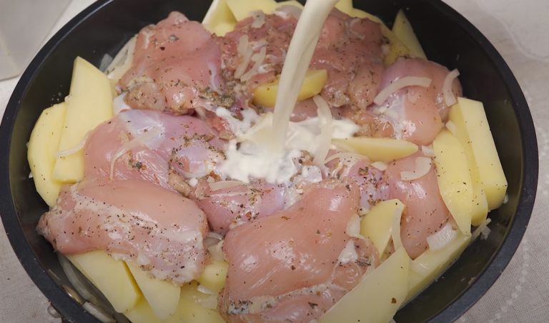 4. A na koniec, obrane i pokrojone w ćwiartki ziemniaki. Całość zalej słodką śmietanką i przykryj naczynie folią aluminiową.