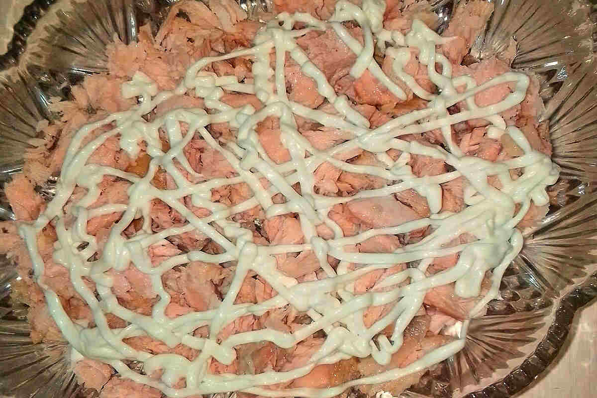 2. Fileta z różowego łososia, pokrój w kostkę i ułóż na dnie dużej miski. Wysmaruj ją majonezem, a następnie ułóż warstwę posiekanej cebuli, startych na tarce o grubych oczkach ziemniaków, dopraw do smaku solą i posmaruj majonezem.