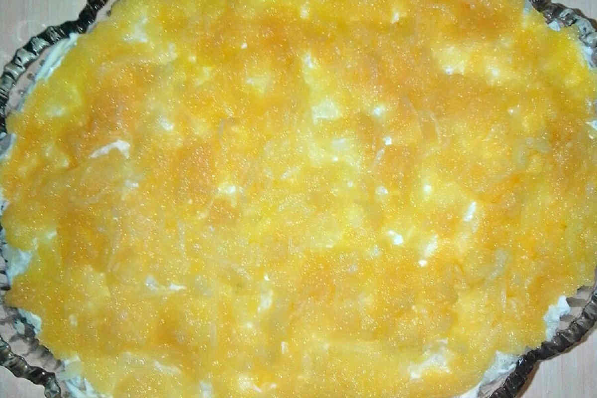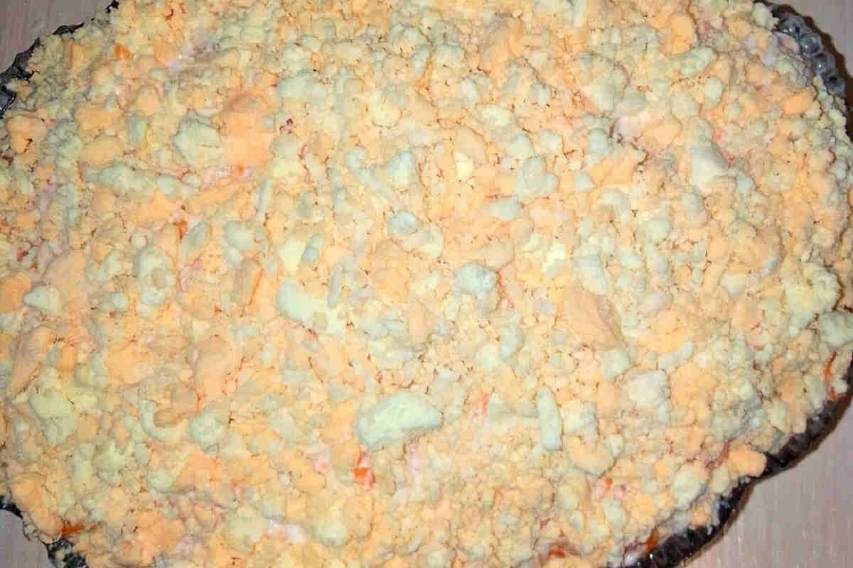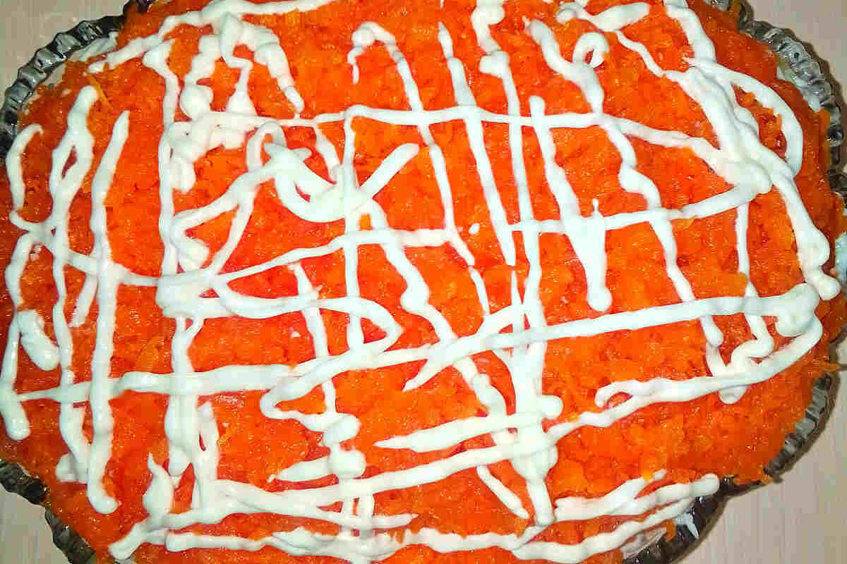 4. Ugotowane jajka obierz, oddziel białka od żółtek. Białka, zetrzyj na tarce o grubych oczkach i ułóż w następnej warstwie, posmaruj majonezem. Teraz zetrzyj na tarce o grubych oczkach marchewkę i wyłóż w kolejnej warstwie – posmaruj majonezem.