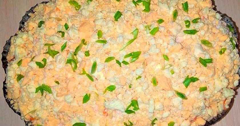 4. Ugotowane jajka obierz, oddziel białka od żółtek. Białka, zetrzyj na tarce o grubych oczkach i ułóż w następnej warstwie, posmaruj majonezem. Teraz zetrzyj na tarce o grubych oczkach marchewkę i wyłóż w kolejnej warstwie – posmaruj majonezem.