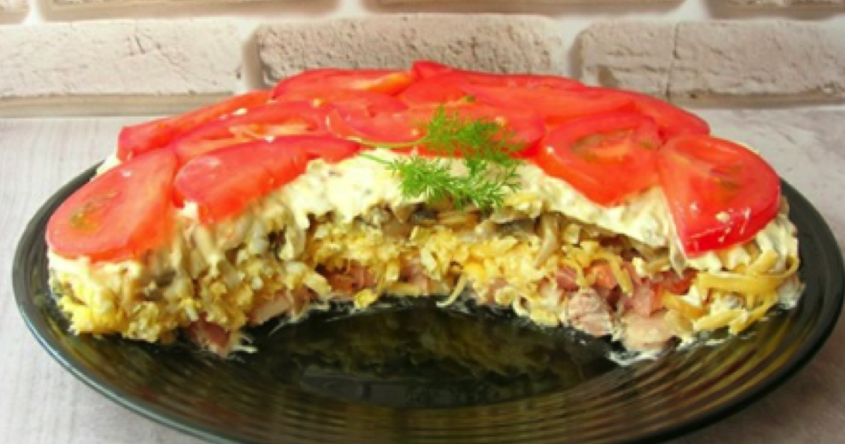 4. W dużej misce, układaj warstwami: Pokrojonego kurczaka, warstwa majonezu, starty ser, połowa pokrojonych jajek, warstwa majonezu, pieczarki z cebulką, pozostałe jajka, warstwa majonezu, a na wierzchu plasterki pomidora. Gotowe!