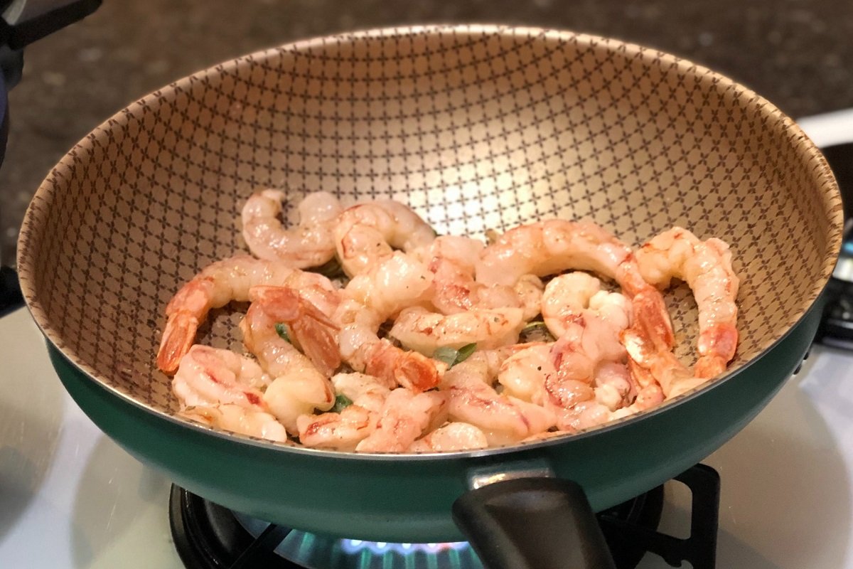 1. Krewetki oczyścić i podsmaż na maśle, jeśli są mrożone nie zapomnij wcześniej ich rozmrozić. Usuń pestkę z awokado i pokrój je w kosteczkę.