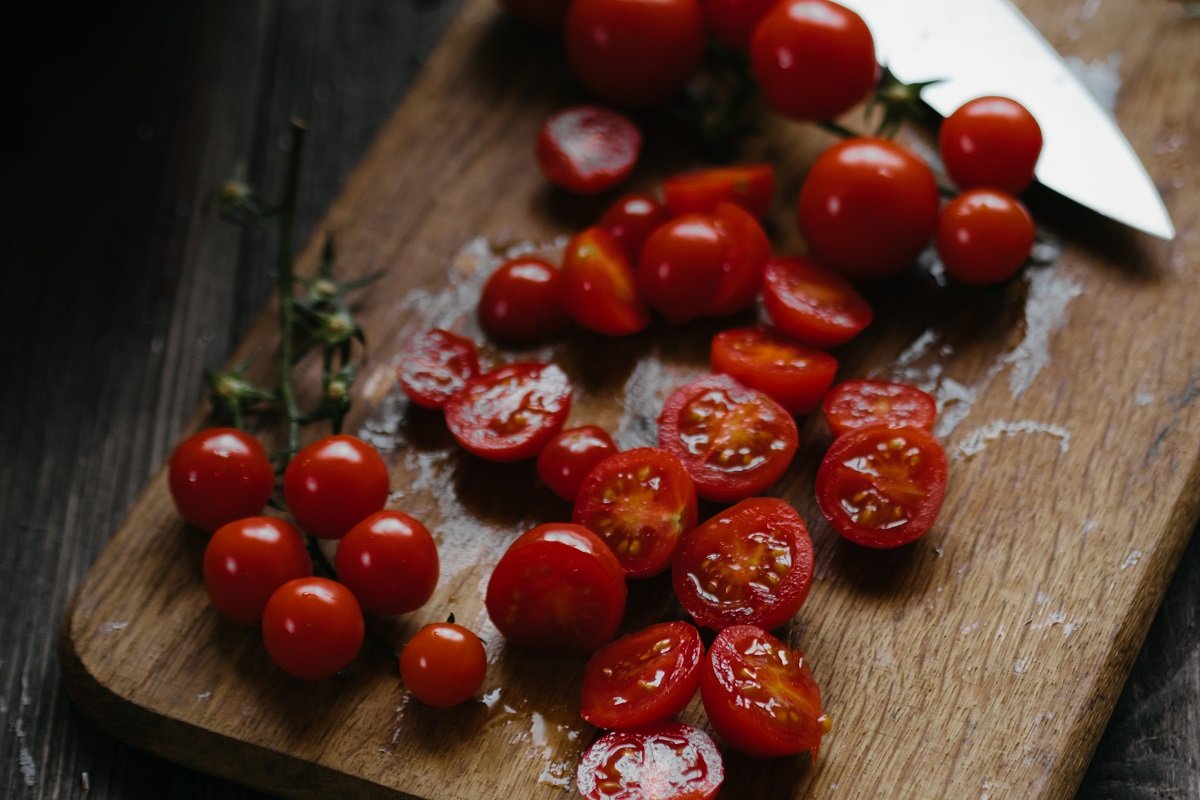 2. Pomidorki koktajlowe, przekrój na cztery, rukolę umyj pod ciepłą, bieżącą wodą.