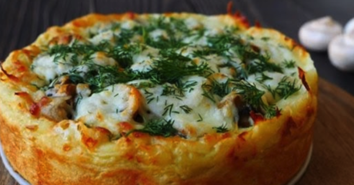 5. Okrągłą formę, wyłóż papierem do pieczenia. Na jego dnie i brzegach, rozprowadź ciasto ziemniaczane, a w środku wykonaj wgłębienie.