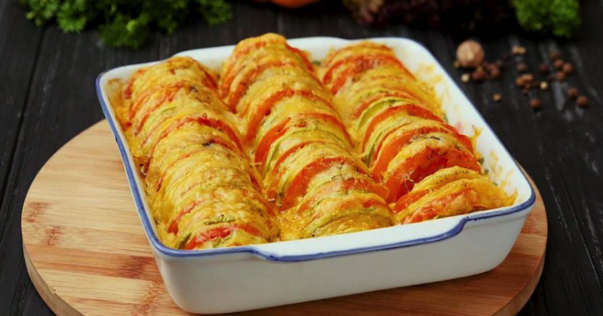 1. Obraną i pokrojona w kostkę cebulę, zeszklij na rozgrzanej patelni z olejem. Gotową cebulę, ułóż w naczyniu żaroodpornym. Następnie, poukładaj naprzemiennie pokrojone w plasterki ziemniaki, pomidory i cukinię.