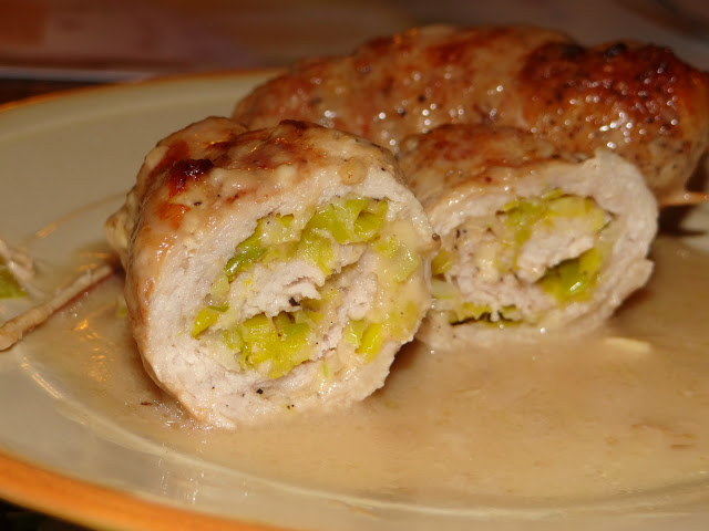 3. Starty na tarce o drobnych oczkach ser, wymieszaj z przestudzonym porem. Na plastrach schabu, ułóż porcję nadzienia i zawiń szczelnie, pomagając sobie wykałaczkami.