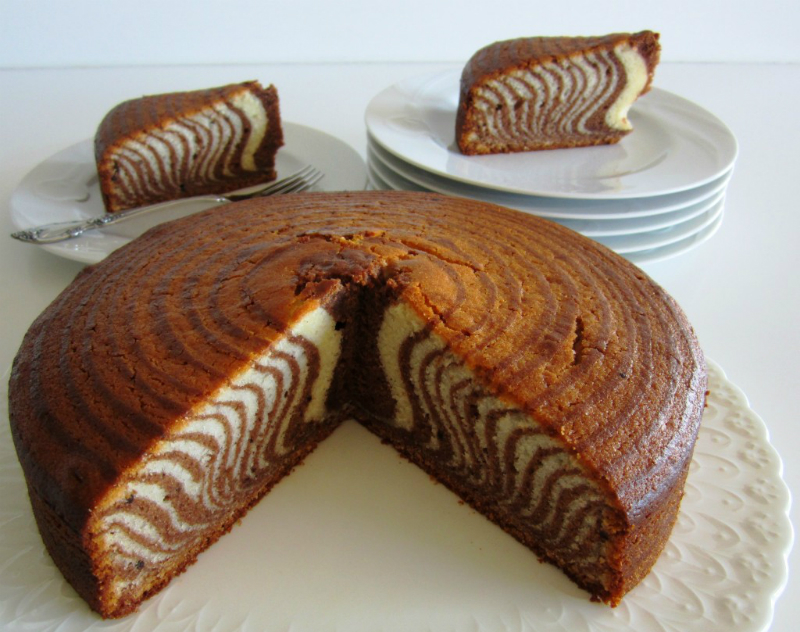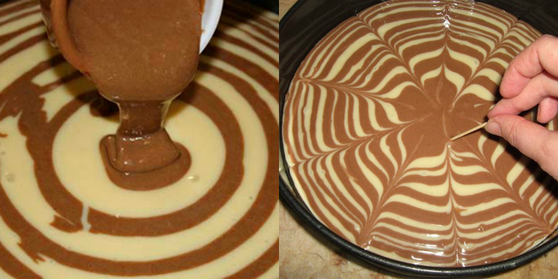 3. Gotowe ciasta, wlewaj naprzemiennie do formy wysmarowanej olejem słonecznikowym, zaczynając od zewnętrznej części formy do środka. Wykałaczką utwórz wzory – będzie pięknie wyglądało po pokrojeniu.