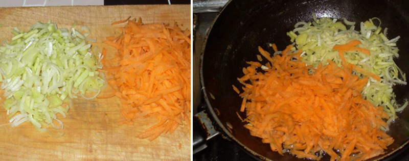 1.Dokładnie obierz marchew oraz cebule, po czym zetrzyj je używając do tego tarki na dużych oczkach. Potrzebna będzie duża patelnia, na której rozpuść masło, następnie wrzuć starte warzywa i smaż do momentu, aż marchew będzie miękka, a cebula szklista. Na mniejszą kostkę pokrój obrane oraz umyte ziemniaki.