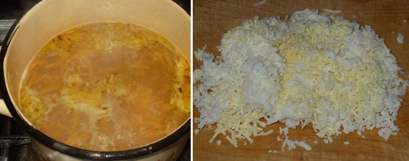 2.W garnku ugotuj jajka na twardo, następnie na tarce o dużych oczkach dokładnie je zetrzyj. Do gotującego się bulionu dodaj groszek oraz pokrojone ziemniaki. Całość gotuj, aż ziemniaki będą miękkie. Następnie wrzuć także podsmażoną cebulę oraz marchew i starte jajko.